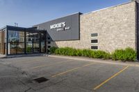 This is an image of a business district in Toronto, Ontario, Canada. The clear sky above highlights the variety of architecture, including office buildings, shops, and houses. The parking lot and road surface in front of the buildings are made of asphalt. The photo showcases the real estate and property in the area, with storefronts and businesses bustling during the day. In the distance, a community center can be seen. This image represents a typical urban scene in Toronto's business district.