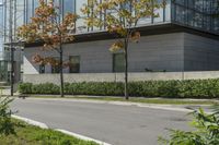 A modern architecture office building in the business district of Toronto, Canada. The high-rise is surrounded by vibrant vegetation and trees in various shades of autumn. The clear sky provides a beautiful backdrop.