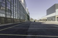 A modern architecture warehouse in a suburban neighborhood of Toronto, Canada. The clear sky casts hard shadows on the open space, highlighting the urban design and infrastructure. A picturesque day in the city.