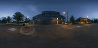 A night scene in Toronto, Canada. The intersection of a parking lot and an office building is illuminated by street lights. Dark clouds create a dramatic backdrop. A perfect example of urban design in a metropolitan area.