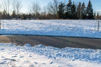 A snowy road in Toronto, Canada, surrounded by autumnal landscapes. A clear sky reflects the winter day, creating a serene and picturesque scene. Nature and city coexist in this tranquil setting.