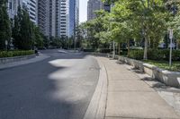 A view of a straight road in Toronto, Canada's urban landscape. Modern architecture lines the residential neighborhood, while trees provide a touch of nature. The road surface and walkways showcase Toronto's urban design and infrastructure.