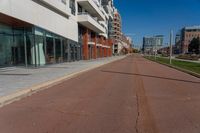 A view of a straight road in Toronto, Canada, lined with office buildings and residential areas. The clear sky complements the urban design of the city. The asphalt road surface and composite material facades create a modern and dynamic atmosphere.