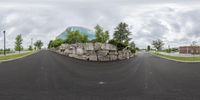 A modern office building in Toronto, Canada, surrounded by a landscape of grass, trees, and large boulders. The building's unique architecture stands out against the straight road and sidewalk. A perfect blend of nature and urban infrastructure.