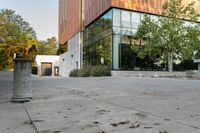 This is an image of a residential area in Toronto, Canada. The clear sky and sunlight make the buildings and vegetation stand out against the blue backdrop. The architecture consists of residential buildings with brick facades and composite material. The road surface is made of asphalt, and shadows from the trees create interesting patterns on the ground. The image captures the suburban feel of the neighborhood, with condominiums and land lots. In the foreground, a theater can be seen with leafy trees surrounding it. This photo represents a typical day in a Toronto residential area.
