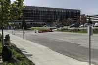 Empty car park along the road in front of a large building with glass doors in Toronto's financial district. Modern architecture blends with urban design, surrounded by the city's bustling business district.