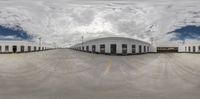 a fish eye lens reflecting a warehouse in a parking lot filled with lots of buildings