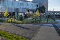a city street surrounded by grass and tall buildings at the end of a street there is a paved pathway in front of the building