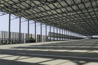 This image captures the urban landscape of Toronto, Canada. The photo shows a large parking garage with metal structures and walkways, providing an open space for cars. The symmetry of the design creates a visually appealing pattern, highlighted by the clear sky above. The concrete surface of the parking deck contrasts with the wooden ceiling and flooring, adding warmth to the scene. This image represents urban design and the efficient use of space in a city like Toronto.