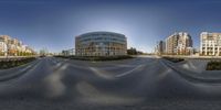 a panoramic photo of a city street intersection with buildings and a curved street