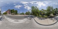 a 360 - shot of a street in the city has trees and a building in the background