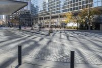 A view of a modern high-rise building in the business district of Toronto, Ontario. The building's sleek architecture and reflective surfaces create a striking contrast against the urban landscape. City life thrives with a mix of residential, commercial, and public spaces.