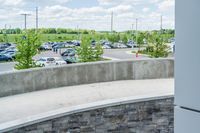 A suburban road in Toronto, Canada. Clear day with scattered clouds. The concrete street curves gently, leading to a residential area. Highway entrance and exit ramps can be seen in the distance.