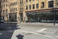 A classic architecture office building in downtown Toronto. The sleek facade and large windows reflect urban design. Hard shadows cast on the asphalt road surface capture the energy of city life.