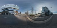 A fisheye lens captures the modern architecture of a mixed-use property in Toronto. The bustling city street is lined with vibrant banners and signage. Clear skies and hard shadows create a dynamic cityscape.