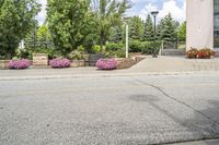 This stock photo showcases the modern architecture and urban design in Toronto, Ontario, Canada. The image captures a beautiful cityscape with a road covered in asphalt, lined with trees and shrubs. The surrounding grass and vegetation add a touch of nature to the residential area. The photo is taken during the day, with fluffy clouds decorating the sky. A walkway and road surface lead the viewers through the landscape, while the profile of a person can be seen enjoying the public space. The park and botanical garden are filled with colorful flowers, creating a vibrant and lively atmosphere. This image perfectly captures the essence of city life and recreational activities in Toronto, particularly during the spring season.