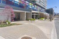 A view of a modern high-rise condominium building in the suburbs of Toronto, Ontario. The urban design features a well-maintained neighborhood with tree-lined streets and sidewalks. City life is vibrant with bustling crossings and entryways.