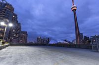 This is an image of a cityscape in Toronto, Ontario, Canada. The photo captures the architecture of the city with its skyscrapers, high-rise office buildings, and parking decks. The concrete surfaces and artificial lights create a vibrant and urban atmosphere. The city is illuminated by the yellow and blue lights at night, contrasting with the grey sky. This image represents the bustling business district of Toronto, showcasing the metropolitan area's modern and dynamic vibe.