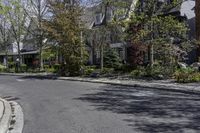 A classic residential street in Toronto, Ontario. Lined with classic architecture houses and framed by trees and bushes. The road surface is asphalt, with clear skies overhead. An idyllic neighborhood scene in Canada.