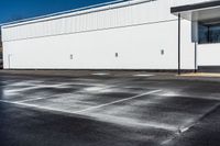 A clear day in Toronto, Ontario. Water is sprayed on the asphalt road in front of a city building, creating a glistening effect. The cityscape is dotted with storefronts and parking lots.