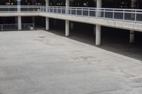 An elevated concrete bridge in Toronto, Ontario. The grey sky hangs over the city as the high guard rail and handrail provide safety on the walkway. The parking garage below adds to the urban architecture.