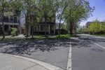 A classic residential neighborhood in Toronto, Ontario. Straight down the road, lined with charming houses and lush vegetation. Clear sky overhead highlights the beautiful architecture and urban design of the city.