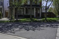 a big two story house on a street corner with a sidewalk and lawn area in front