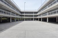 This image features a modern urban office building located in Toronto, Ontario, Canada. The building has a sleek design with a mix of concrete, metal, and glass facade. The straight road in front of the building leads to a spacious parking deck and garage. The surrounding urban design includes a beautiful park and walkway. The elevated view showcases the building's high floors and clear sky backdrop. This mixed-use building serves as a headquarters and offers plenty of office space. The surface of the parking deck is made of high-quality flooring. A stadium can be seen in the distance, adding to the vibrant cityscape of Toronto.