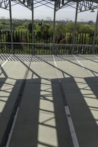 This is an image taken from an elevated position in Toronto, Canada. The photo captures the urban landscape of the city, showcasing the architecture and infrastructure. The straight road leads to a parking deck surrounded by trees and vegetation. The clear sky provides a beautiful backdrop to the scene, casting shadows on the concrete surface. This urban biome is a perfect blend of high-rise buildings and open green spaces, offering a leisurely atmosphere. The photo represents the urban design and profile of Toronto, showcasing its unique features and vibrant energy.