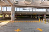 large open parking area with large circular light on top of the roof and yellow painted arrows on the floor