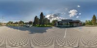 A view of a parking lot at an intersection in Toronto. Modern architecture of office buildings and residential areas surround the open space. A car is parked underneath, adding a touch of urban design.