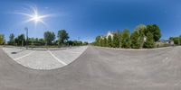 a 360 - view of a street showing trees and buildings in the background with a man on a skateboard