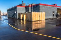 This image features a parking lot in Toronto, Ontario, Canada. The lot has a red roof and yellow painted lines indicating parking spaces. People are seen walking outside of the building. The clear sky above adds a touch of vibrancy to the scene. It depicts a typical day in Toronto where people are out and about, enjoying the city and dining at restaurants. The asphalt road in the foreground further enhances the urban feel of this photo.