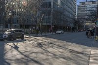 This photo captures the modern architecture and urban design of a neighborhood in Toronto, Canada. The straight road stretches ahead, lined with trees and buildings. The asphalt road surface shines under the sunlight, reflecting the hard shadows and vibrant colors of autumn. Vehicles, including cars with their tires and wheels, drive along the thoroughfare. People can be seen walking on the sidewalk, adding to the bustling atmosphere of the city. This image showcases the combination of infrastructure, vegetation, and human activity that defines the urban landscape of Toronto.