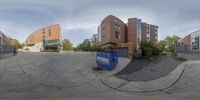 Aerial view of a school complex in Toronto, Canada. The architecture features multiple buildings and blue bins. The clear sky and straight road create a peaceful atmosphere in the suburban neighborhood.