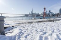 A view of Toronto's skyline on a sunny winter day. The modern architecture of skyscrapers contrasts with the frozen surface of Lake Ontario. The city's harbor and pier provide a coastal backdrop.