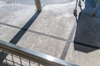 people are walking in the courtyard and parking lot at a station with no one nearby