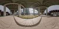 A unique perspective of Toronto's urban design. The fish-eye lens captures the curved walkway, surrounded by modern architecture and high-rise buildings. The top-down view reveals the city's infrastructure and public spaces.