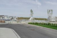 This is an image of an empty paved road in Toronto, Canada. The road stretches along the water, with land lots and vegetation on either side. The clear sky is reflected in the water, adding to the urban design of the area. Overhead power lines can be seen running parallel to the road, providing electricity to the surrounding area. This photo captures the peacefulness of this urban landscape, with the absence of cars and the serenity of the water. It represents a typical scene in Toronto.