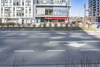 A view of a modern residential neighborhood in Toronto, Ontario. The cityscape features sleek buildings with large windows, lined by asphalt roads. The autumn foliage adds color to the urban design against the backdrop of a clear sky.