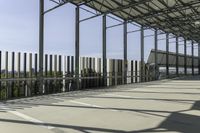 This stock photo showcases urban infrastructure in Toronto, Canada. The image features a walkway with a wooden fence and symmetric columns. The clear sky and natural light create a beautiful play of shade on the concrete surface. The scene captures the blend of urban design and functionality, including a parking deck in the background. The photo can be used to represent urban development, architecture, or warehouse concepts in Toronto.