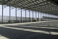 A symmetrical open space in Toronto, Canada. The long covered warehouse area is lined with metal poles and surrounded by a fence and walkways. Clear sky adds to the urban design aesthetic.