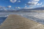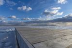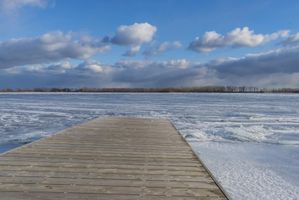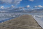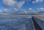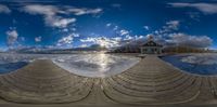 some clouds a light buildings snow and water and trees in the distance, in a 360 - shot