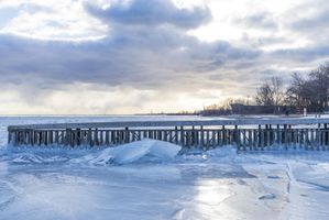 A panoramic view of Toronto's waterfront on a winter day. The dome-shaped buildings and open spaces reflect on the calm, freezing water. Snow-covered trees line the shore, creating a serene winter landscape.