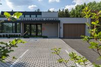 A modern office building in the heart of Toronto's business district. The white sign and brown wood doors make it easy to spot. Surrounded by vegetation, the building stands out against the clear blue sky.