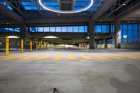 An empty parking garage in Toronto, Canada, illuminated by circular lights at dusk. Concrete streets and barriers create an open space. The dark night highlights the artificial light. Parking meters add to the urban atmosphere.