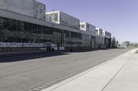 A modern office building with a glass facade stands in a clear sky day in Toronto, Canada. The urban architecture contrasts with the open suburban space. Hard shadows accentuate the warehouse-like design.