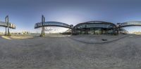 A clear sky frames a train station at dusk, creating a symmetrical composition. The building's hard shadow stretches across the road surface, while the city's lights reflect on the calm lake. A picturesque urban scene.