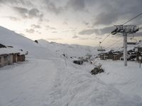 the ski lift is above all snow in the village, but no people are traveling