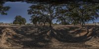 A scenic view of a tree-covered dirt hill with two trees - one large and the other smaller. The sunlight casts shadows on the grassy plain below. A peaceful rural landscape.